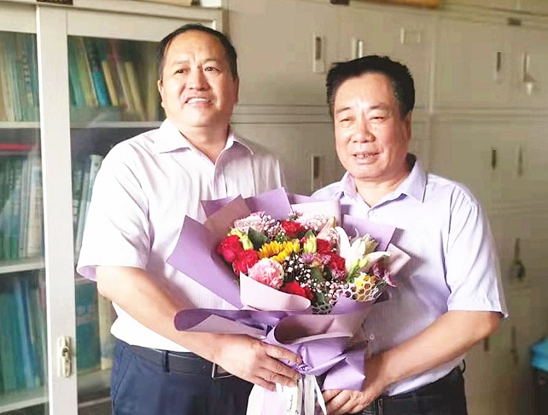 在王金信教授的办公室里,嵇景涛副校长将一束鲜花送到王金信教授手中,并感谢王金信教授对学校学科发展做出的突出贡献,要求学院今后为老党员、老教授做好各项服务工作,希望王金信教授在保重身体的同时,继续为学校的发展建言献策。
