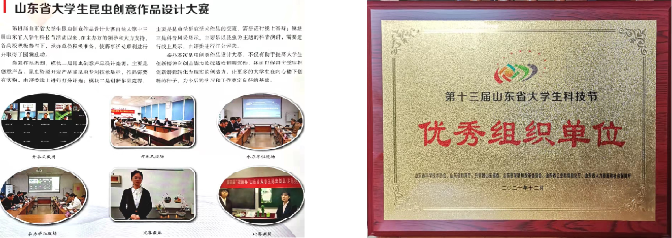 “山东省大学生科技节”是我省举办重要大学生赛事,由山东省科学技术协会、山东省教育厅、共青团山东省委、山东省发展和改革委员会、山东省工业和信息化厅、山东省人力资源和社会保障厅主办。自2018年,山东昆虫学会联合山东虫业协会作为承办单位申请“山东省大学生昆虫创意作品设计大赛”获批作为大学生科技节的一个赛事,至今已经成功举办了四届,第一届(2018年)、第二届(2019年)在山东第一医科大学举行,第三届(2020年)、第四届(2021年)分别在山东农业大学和青岛农业大学举行。四届大赛均得到了承办学校、学院领导们的关心支持。每届大赛都报名踊跃,作品精彩纷呈,大赛的举办对全省大学生认识昆虫世界、走进并了解大自然和培养对科学积极探索的精神起到了重要引导和推动作用。