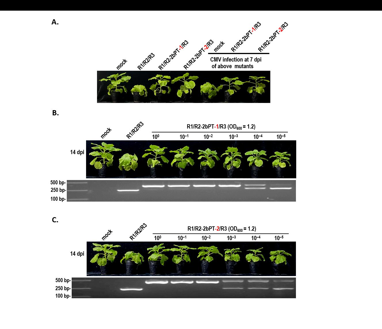 进一步研究表明,高浓度接种时不发生回复突变的RNA1 TLS突变体,若混合2b蛋白(CMV编码的基因沉默抑制因子)突变同时接种,则回复突变率为100%。暗示可能是基因组整体复制量的低水平导致回复突变。随后的RNA1 TLS突变体的梯度稀释接种实验表明,稀释至野生型CMV病毒的稀释限点(OD600=1.2X10-4)时,回复突变发生。说明,回复突变的第二层次是初始接种浓度的高低,接近野生型稀释限点的接种浓度容易触发回复突变。