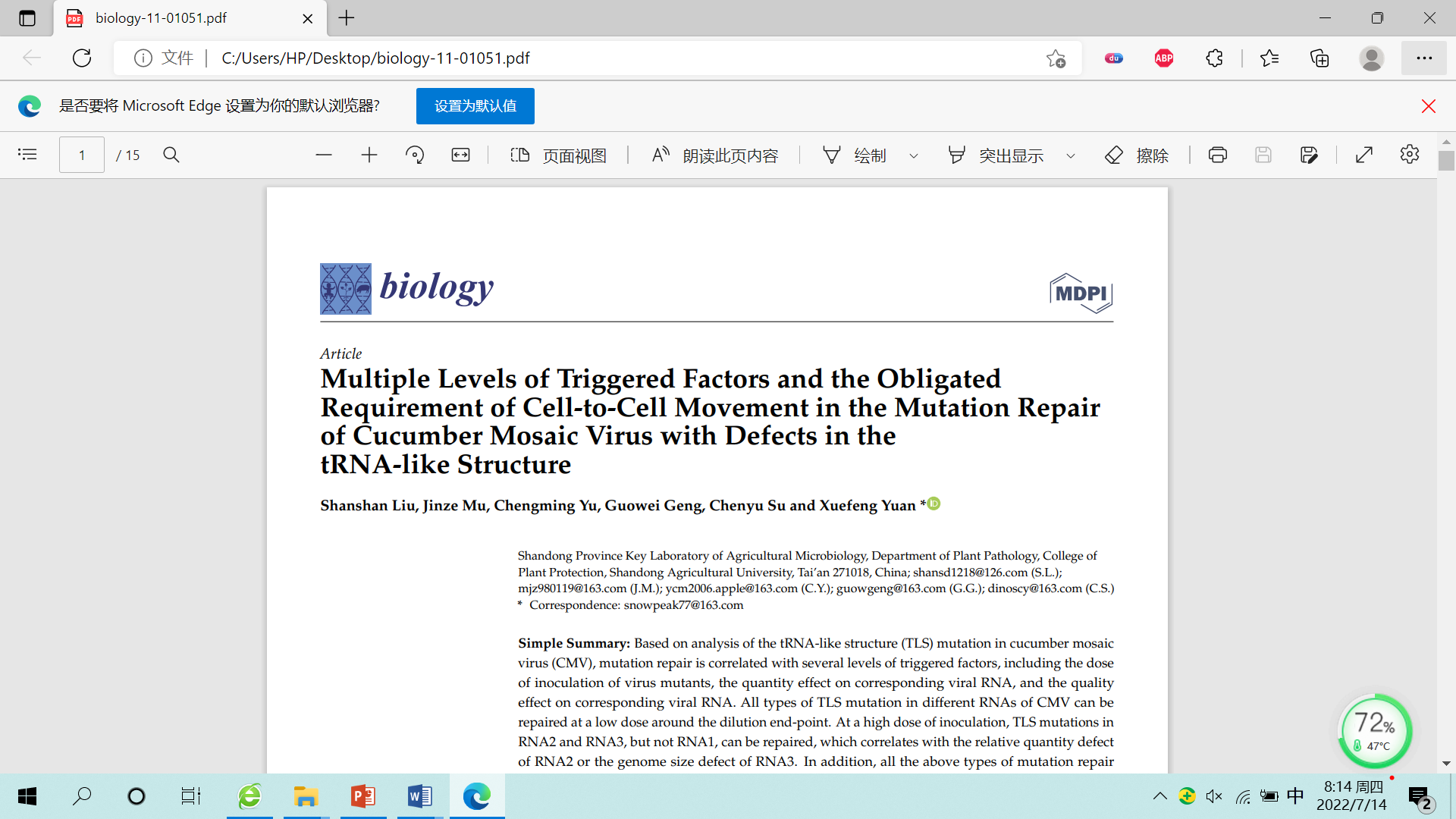 2022年7月13日,365BET官网网站原雪峰教授领衔的分子植物病毒学研究团队,在国际生物学期刊《Biology》在线发表了题为“Multiple levels of triggered factors and the obligated requirement of cell-to-cell movement in the mutation repair of cucumber mosaic virus with defects in the tRNA-like structure”论文。该研究为植物RNA病毒分子进化和弱毒疫苗实际应用提供了重要参考,具有重要理论价值和应用借鉴。