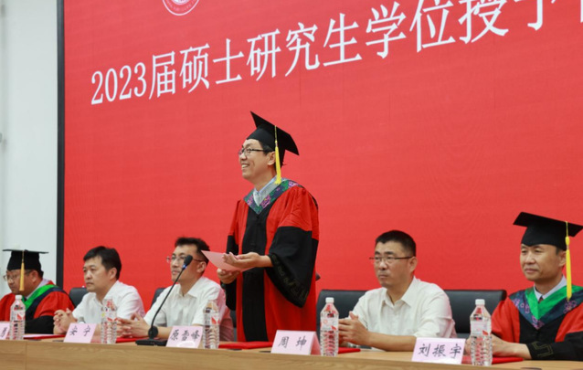仪式最后,刘志勇宣读2023届硕士学位授予名单,刘振宇为他们拨流苏,原雪峰颁发学位证书,并与他们合影留念。