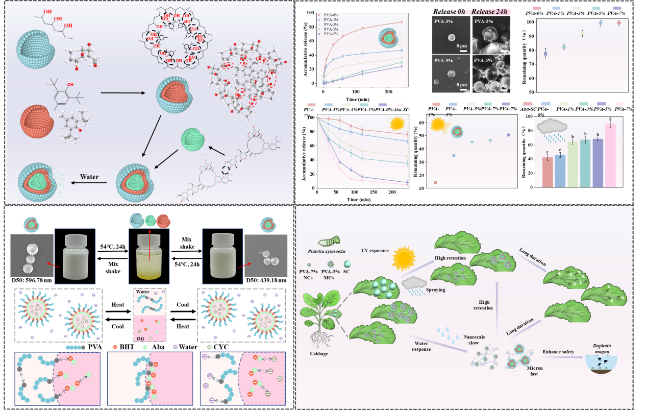 针对纳米制剂当前存在的“工艺繁琐、稳定困难、释放过快”问题,该研究以聚乙烯醇(PVA)和丁基羟基甲苯(BHT)为原料,采用一步溶胶-凝胶法,借助氢键作用实现了微/纳米颗粒的可逆制备与粒径调控。通过稳定包裹农药与抗氧化剂的协同作用,能够延缓光降解进程,可依据环境条件变化释放活性成分,进而减少损失,从材料设计与制备工艺双维度突破了传统工艺的局限。