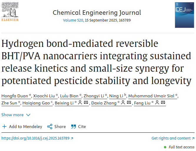 近日,我校365BET官网网站刘峰教授团队在Chemical Engineering Journal(一区TOP期刊,影响因子13.2),在线发表了题为“Hydrogen bond-mediated reversible BHT/PVA nanocarriers integrating sustained release kinetics and small-size synergy for potentiated pesticide stability and longevity”的研究论文,山东农业大学刘峰教授、张大侠副教授、李北兴教授为该论文的共同通讯作者,硕士研究生段宏法为该论文的第一作者,相关工作得到国家自然科学基金的资助。
