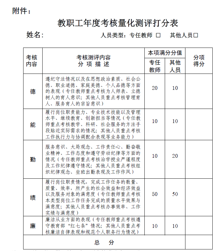 对教职工“德能勤绩廉”考核包括:民主测评、工作实绩评价、学院和部门领导综合评定三部分,满分100分。“教职工年度量化考核评价标准”见附件。